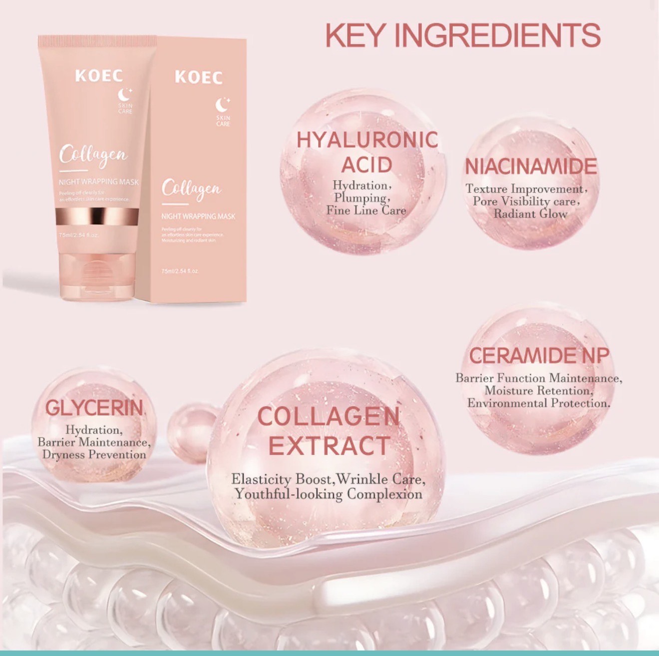 Wake up to radiant, smooth skin with the KOEC Collagen Night Wrapping Mask — your overnight skin savior. This lightweight gel-based mask forms a breathable film that locks in moisture, improves skin elasticity, and visibly revitalizes dull, tired skin. Infused with skin-loving collagen, this mask supports firmness and hydration, all while you rest.